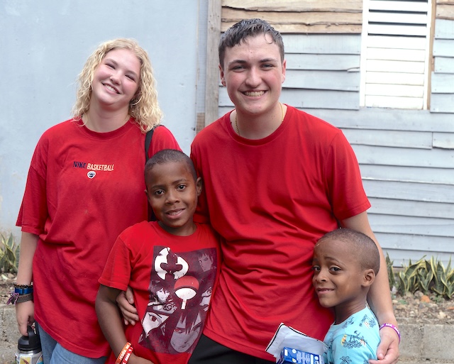 2025-07-09 - Santiago, Dominican Republic - Photo courtesy Lindsey Wilson University. Lindsey Wilson University students Kameron King of Madisonville, Kentucky, and Braxton Crook of Lebanon, Tennessee, are joined by two students from their vacation Bible school in Santiago, Dominican Republic.