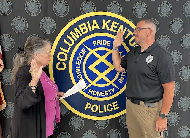 2025-07-09 - Columbia, KY - Photo courtesy City of Columbia. Columbia Mayor Pam Hoots swears in Tracy McCarol as the newest member of the CPD. McCarol will serve as a School Resource Officer (SRO) for Adair County Schools at Adair County High School.
