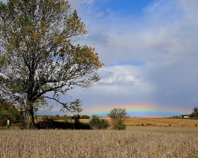 A little fuss was involved getting the photo; as usual I had vehicles lined up in behind me (since I poke along doing photography). I caught a glimpse of it initially to my left, and had to wait for the line of cars to pass before I could park near the soybean field in the photo. Then, knowing rainbows diminish about as quickly as they appear, I had to choose my composition rapidly-an (unseen) barn on the left or the tree in the field. The tree was more strategically positioned...so here's the shot!"