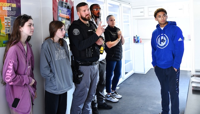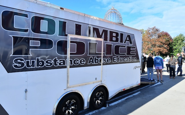 2025-10-17 - Columbia, KY - Photo courtesy Lindsey Wilson University. To illustrate to Lindsey Wilson University students how Columbia-Adair County law-enforcement officials deal with alcohol and drug abuse, the Columbia Police Department brought its Substance Abuse Education trailer to campus on Thursday, October 16, 2025.