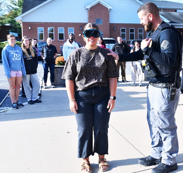 2025-10-17 - Columbia, KY - Photo courtesy Lindsey Wilson University. Columbia Police Sgt. Trevor Foster administers a field sobriety test to Lindsey Wilson University student Ally Brown '26 of Columbia while she wears a pair of alcohol-impairment simulation goggles during a "Substance Abuse" class on Thursday, October 16, 2025.