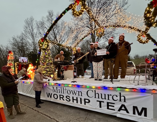 Brenda Mann and Ellen Zornes presented the first place prize to Milltown Church Worship Team after the judging Saturday night before the Christmas in Columbia parade.