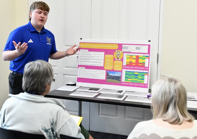 Lindsey Wilson University student Deric Shearer '26 of Nancy, Kentucky, discusses his research project, "Argumentative Essay Writing" for seventh grade students. Shearer presented his research in the Roberta D. Cranmer Dining & Conference Center during Lindsey Wilson's 2025 fall semester Academic Celebration Week.