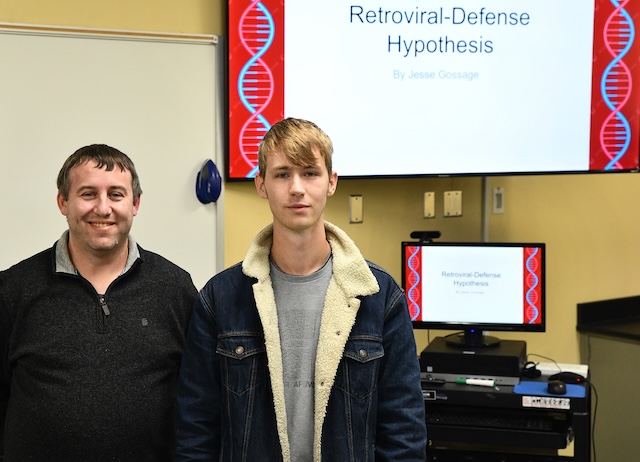 Lindsey Wilson University student Jesse Gossage '26 of Russell Springs, Kentucky, right, presented "Retroviral-Defense Hypothesis," which he developed while studying under chemistry professor Andrew Johnson. Gossage presented his research in the Jim & Helen Fugitte Science Center during Lindsey Wilson's 2025 fall semester Academic Celebration Week.