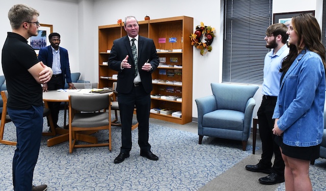 Attorneys Laurent A. Cadet and Dustin Beard '07, center, both of Elder Law Advisors of Lexington, speak with Lindsey Wilson University students Nick Blakey '26 of Russell Springs, Kentucky, left, and Jason Womack '26 of Russell Springs and Grace Adams '26 of Bethlehem, Kentucky. The students were in the "Business Policy" class that presented marketing ideas to Beard and Cadet.