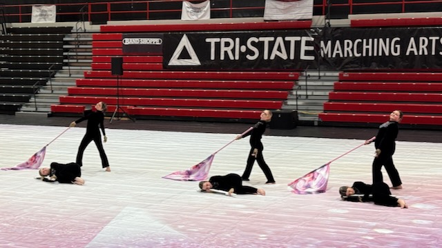 Members of the Adair County High School Winter Guard on the floor in the Tristate Marching Arts competition held at RD Campbell Junior High in Winchester on Saturday, February 1, 2025. Adair County received the second highest Division III score in the Scholastic Regional A bracket, (58.940), and the Adair Co JV guard was 1/1 in the Scholastic Concert Open bracket.