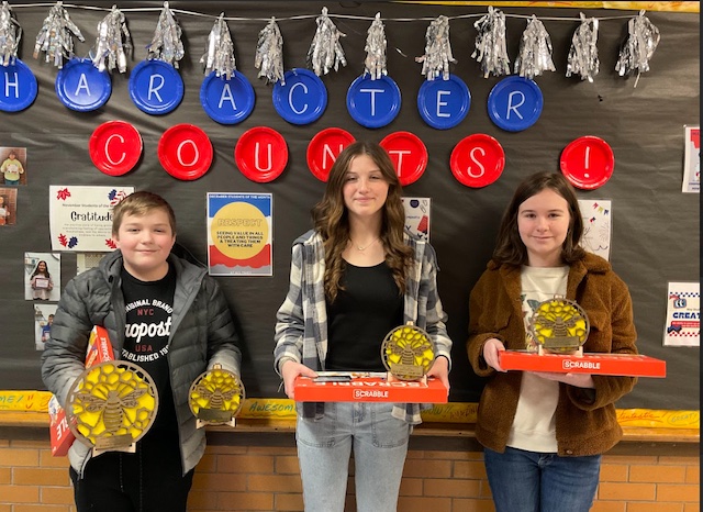 2025-01-15 - Columbia, KY - Photo from Kayla Stockton. Sixth-grader Reed Duncan (left), Seventh-grader Chloe Grider (right), and Eight-grader Emma McGuffin (center) were the grade level winners in the Adair County Middle School Spelling Bee. These 3 students out-spelled the rest of the 25 class-level winners, and went head to head for several rounds. Reed Duncan was the eventual School Champion, and will advance to the Regional Spelling Bee in Lexington this March.