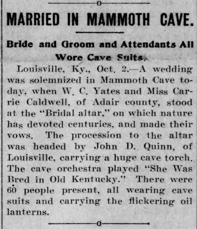 Louisville, Ky., Oct. 2, [1901] - A wedding was solemnized in Mammoth Cave today, when W. C. Yates and Miss Carrie Caldwell, of Adair County, stood at the "Bridal altar," on which nature has devoted centuries, and made their vows.
