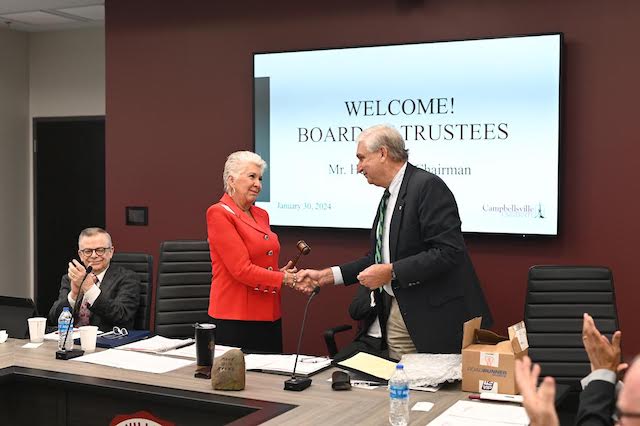 2025-01-17 - Taylor County, KY - Photo by Gerard Flanagan, CU Communications. Dr. Hilda Legg begins her term as Campbellsville University's next Board of Trustee Chair. She is pictured receiving the gavel from former Chair Henry Lee. Legg is a native of Adair County and a graduate of CU. Lee's father and grandfather both served as trustees at CU. At left is Board Member and CU leader John Chowning.