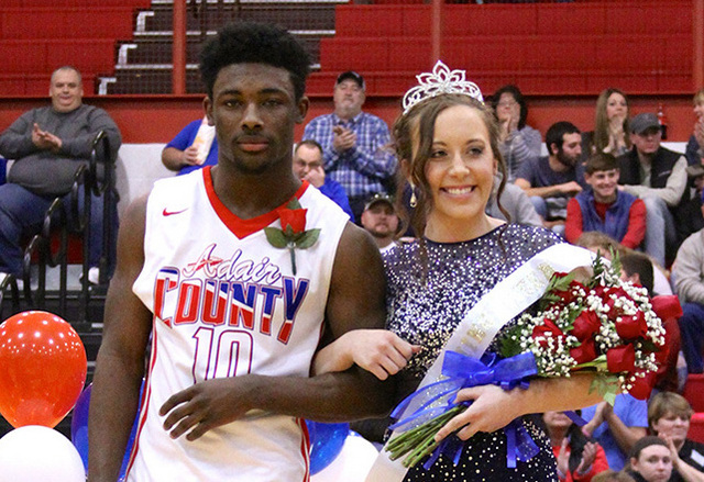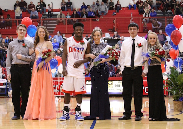 2017-01-17 - John Burr Memorial Gymnasium, 526 Indian Drive, Columbia, KY - Photo by Wes Feese, Media Relations, Adair County Schools. Pictured, from left, are Erwin Ruczienski, Olivia Bair, Jordan Lasley, Savannah Roy, Clint Garrison, and Makayla Smith -- this year's Basketball Homecoming court. - Wes Feese
