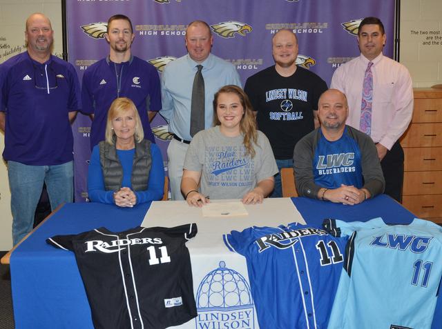 CHS senior Brenna Wethington has signed to continue her softball career at Lindsey Wilson College. She is pictured, front row, above, with her parents, Sheila and John Wethington, and, From left, back, CHS Athletic Director Tim Davis, CHS head softball coach Weston Jones, LWC head softball coach David Dews, Wethington's brother Mason Wethington and CHS Principal Kirby Smith. - Calen McKinney (CIS)