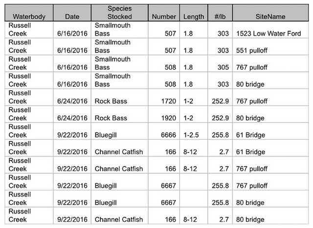 2017-01-13 - Russell Creek - Photo by Barry Stotts, KY Fish & Wildlife Commissioner, District 4. Russell Creek has recently been stocked with Smallmouth Bass, Rock Bass, Channel Catfish and Bluegill. The chart above indicates dates of releases, locations on the creek, weight of fish, length, and the number released. - Barry Stotts