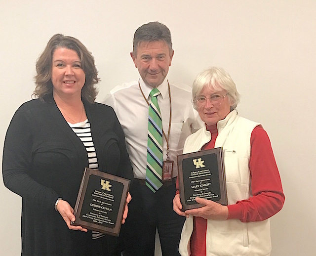 2017-01-14 - Adair Extension Service, 409 Fairground St., Columbia, KY - Photo by Andrea Waggener, Deputy Adair CJE. Debbie Cowan, left, and Mary Knight, right, were presented plaques recognizing their eight years of service on the board of the Adair County Extension Service. With them are Adair County Judge Executive Michael Lee Stephens. The presentation was made Thursday, January 12, 2017, during the consecutive Adair Extension Service Council/Adair Extension Service Board meeting. Paired photo. See - Adair Extension Officers sworn in at Thu 12 Jan meeting