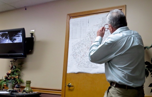 2017-01-13 - CAUD, 109 Grant Lane, Columbia, KY - Photo by Ed Waggener, Columbiamagazine.com(c) . A bit of low tech sleuthing helped GM Lenny Stone pinpoint a priority project needed now, and which may be addressed in coming months. Mr. Stone, above, pointed out where pins had been dropped on a printed Adair County wall map to show where water mains had broken during the past year. For most of the county, he said, the pins look like a shotgun pattern. But in one small area, from the Shepherd Tank to Purdy Separate Baptist Church, it's ground zero, a bullseye where an extraordinary number of pins are concentrated. A further study, he said, revealed that this short, one-third mile stretch is where PVC pipe installed several decades ago, and considered state of the art at the time it was used, later proved to be very brittle. Replacing this section of line, he said, will dramatically reduce water loss for the district. Member David Jones noted this discovery might warrant a big screen Tv, couple with cell phone app which could deliver both a photo of a break and a Google GPS number automatically dropped on a Google map, might be warranted now. Stone said that one of the big area's the Public Service Commission is watching is water loss in a system, with alarms going off when it exceeds 15%. At present, even with the Shepherd-Purdy segment, CAUD's water loss stays below 15%. The photo was taken at the CAUD meeting Thursday, January 12, 2017. - EW