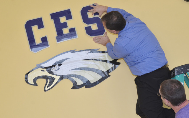 2017-01-13 - Campbellsville Elementary School, 315 Roberts Road, Campbellsville, KY - Photo by Calen McKinney, Public Information Officer, Campbellsville Independent Schools (CIS). Campbellsville Elementary School's main office is fully functional after its renovation. But the office wasn't complete without its CES and eagle lettering. The letters and eagle were moved from the former CES office and recently hung on the walls in the new office. CES Principal Ricky Hunt and maintenance worker Randy Bricken Jr. installed the letters. - Calen McKinney