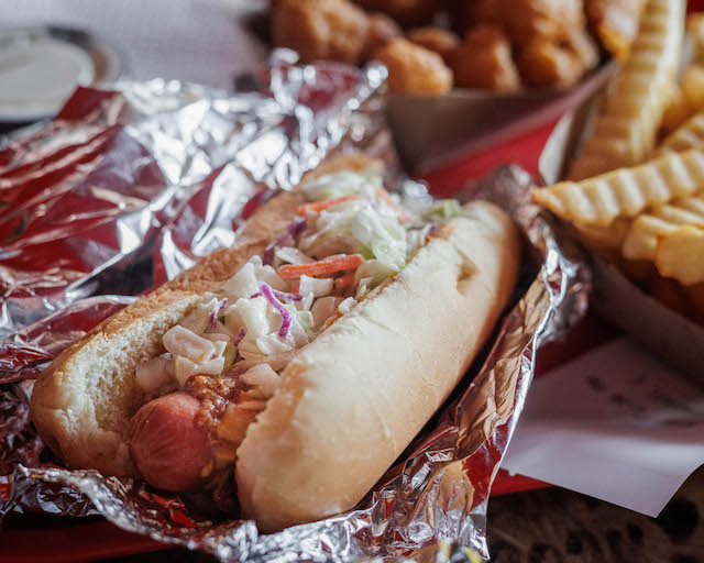 2025-01-09 - LeSage, WV - Photo by Pen. A West Virginia Dog, with chili, mustard, onions, and slaw, is one of the milder creations from Hillbilly Hotdogs, just a few minutes outside Huntington, where diners can choose seats in a repurposed school bus, or even try out the driver's seat.