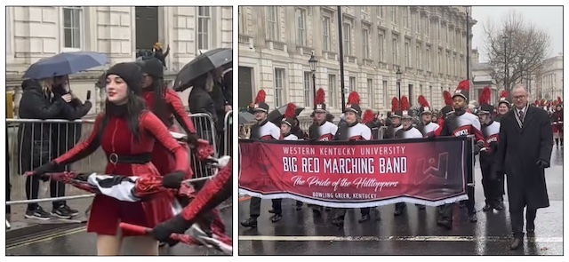 2025-01-02 - London, England - Photo from Chad Bivens. Chad writes, "The Big Red Marching Band from WKU was invited to not only march but to lead the London New Year's Day Parade in London, England this year. Officials from the parade confirm that with 270 members marching, the Big Red Marching Band was the largest band to ever perform in the parade."