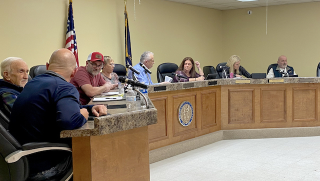 2024-12-30 - Columbia, KY - Photo by Vicky Pike of Miss Vicky\'s Pampered Angus Ranch. The Adair County Fiscal Court met in Special Called session Thursday evening, December 26, 2024, in the Adair County Annex to go over items on a lengthy end-of-year agenda. Pictured as the meeting was getting started are, from left, are: District 4 Magistrate Chris Reeder; District 3 Magistrate Sammy Baker; District 1 Magistrate Tony Denton, Benisha Johnson, AC Judge Executive Larry Russell Bryant, Clerk Amy Pike, County Attorney Jennifer Hutchison-Corbin, and District 6 Magistrate Mark Humphress.