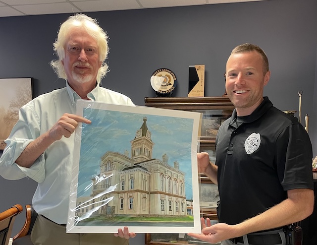2025-11-02 - Columbia, KY - Photo from City Hall, Columbia, KY. Charles Grimsley, at left, was gifted with a painting of the historic Adair County Courthouse last week by Columbia Police Chief Evan Burton who said, "I appreciate Mr. Grimsley and his work in preserving history in Columbia." Grimsley has worked with the City to restore the courthouse clock and bring it back to life.