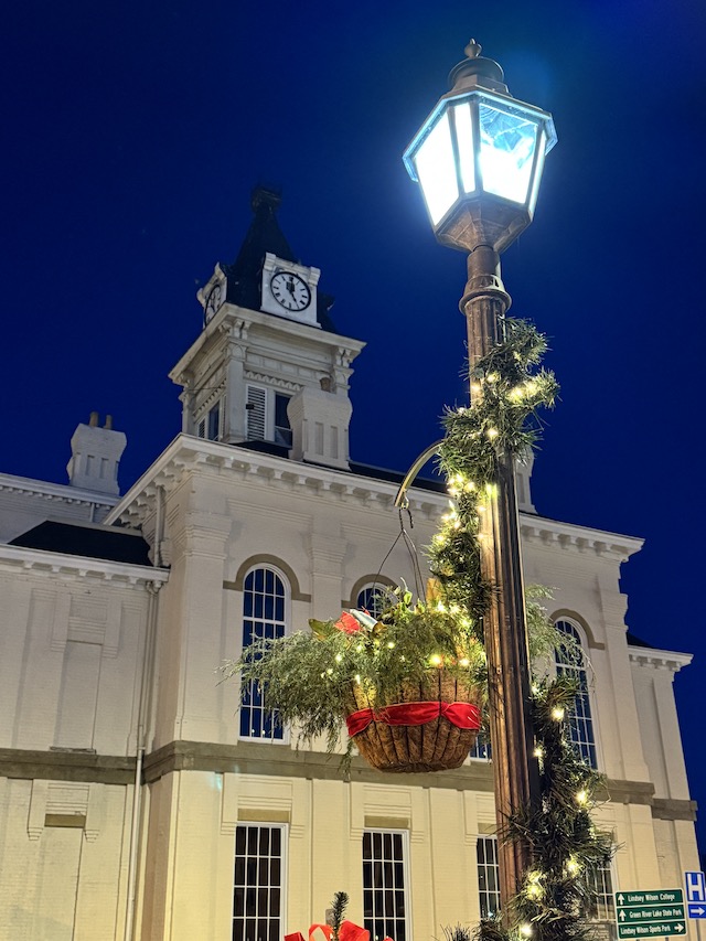 It's Christmas around the Public Square in Columbia and the historic Adair County Courthouse shines with its new coat of paint in the soft lighting of old fashioned decorations around it.