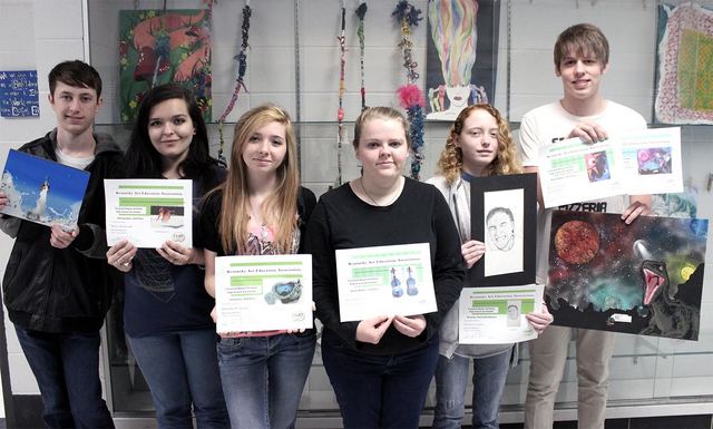 2016-03-17 - Adair County High School, 526 Indian Drive, Columbia, KY - Photo by Shamarie Harper, Adair County Schools Media PR/Technology Resourse Teacher/Migrant Recruiter. This past Sunday, March 13, 2016 the KY Art Educators Association presented awards and placements for advancement to the state level completion. Ms. Cayce Davenport member of the KY Art Educators Association and Art Teacher at Adair County High School was present to receive the results from her students regional entries. ACHS competed in the Caveland Region High School Art competition with great results. Three students and their art work advanced to the state level Tara Pierce received first in Mixed Media, Haley Diamond 2nd in Photography, and Elizabeth Spoon 2nd in Ceramics. Not only did these three young ladies advance to state the ACHS Art Department had numerous other winners and Honorable Mentions. Jacob Absher received 3rd place in Mixed Media and 2nd place in Graphic Design, Tyler McKinney received 3rd place in Digital Art, Courtney Keezer received an Honorable Mention in Photography, and Gabe Wilson received 3rd place in Ceramics. The students shown in the photograph with their artwork or awards in no order are Tara Pierce, Jacob Absher, Tyler McKinney, Haley Diamond, and Elizabeth Spoon. - Shamarie Harper Paired photo. See also: Works of art by other Caveland Art competitors from ACHS