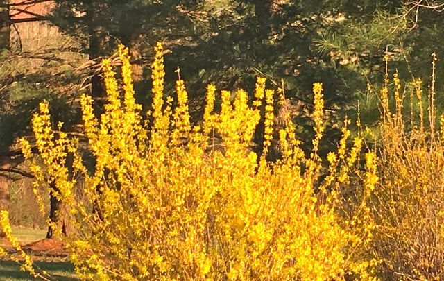 2016-03-17 - Skyline Drive, Edmonton, KY - Photo by Linda Waggener. Forsythia is in full bloom in Edmonton as this lovely bush shows. Located in front of green pine trees, this one really shows off well.