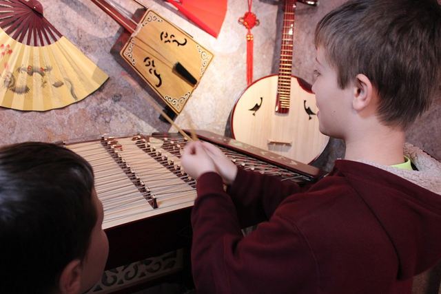 2016-03-16 - ACES, 870 Indian Drive, Columbia, KY - Photo by Shamarie Harper, Adair County School District Media Coordinator. Jonathan Gold was extremely interested in the musical instruments on the Confucius Institutes "The Chinese Cultural Experience" that visited Adair County Elementary School today, Wednesday, March 16, 2016. - Shamarie Harper