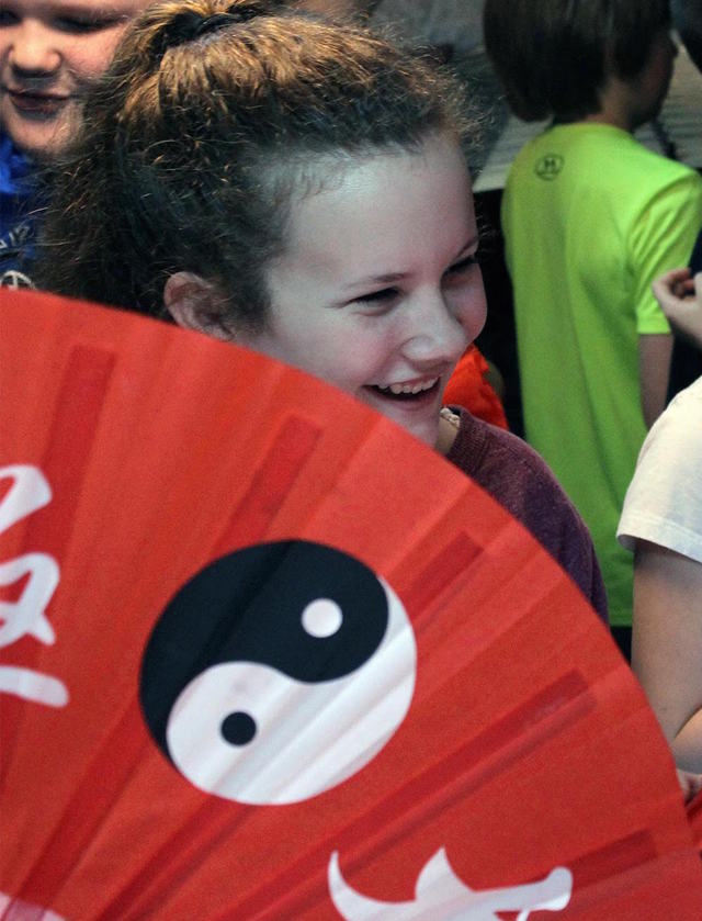 2016-03-16 - ACES, 870 Indian Drive, Columbia, KY - Photo by Shamarie Harper, Adair County School District Media Coordinator. Kailee Brown enjoyed playing with the fans in the Confucius Institutes Mobile classroom "The Chinese Cultural Experience" that visited Adair County Elementary School today. - Shamarie Harper