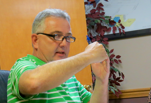 2016-03-16 - Columbia/Adair Utilities District (CAUD), 109 Grant Lane, Columbia, KY - Photo by Ed Waggener. Columbia-Adair Utilities District General Manager Lenny Stone described a bearing as bigger than a golf ball, smaller than a softball, to describe a possible diagnosis on the settling basin problem at the utilities water plant. Commissioners present, Mike Newton, Barry Stotts, David Jones, and Wid Harris voted unanimously, 4-0, to hire local company Fabco, to go into the huge machine, check the bearings and analyze the problem. Fabco has agreed to do the diagnosis for a maximum of $5,000, and if it the repair is within their capability to complete the work with only the cost of materials added. GM Stone and the commissioners agreed that this should be a first step, rather than call in outside experts whose initial costs might be a minimum of $20-30,000. The photo was taken at the Special Regular Meeting of the CAUD board, Tuesday, March 15, 2016. - Ed Waggener