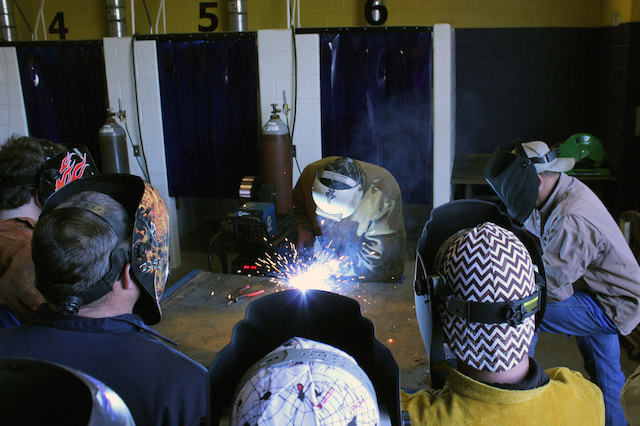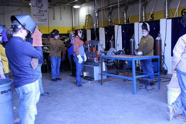 2016-03-16 - Adair County High School, 526 Indian Drive, Columbia, KY - Photo Shamarie Harper, Media Coordinator, ACSD. Professor Watson is demonstrating for students in the Adult Gas Metal Arc Welding class being sponsored by the Workforce Solutions Department at Somerset Community College, in partnership with Adair County Schools and the Lake Cumberland Area Development District. The students were excited they would be actually getting their hands dirty and welding on their second night of class, Tuesday, March 15, 2016. - Shamarie Harper