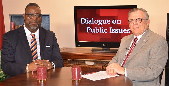 2016-03-16 - WLCU Broadcast Studios, 203 West Broadway, Campbellsville, KY - Photo by Jordan Antle, CU. Dr. John Chowning, executive assistant to the president of Campbellsville University for government, community and constituent relations, right, interviews The Rev. Bernard Crayton, senior pastor of Little Flock Missionary Baptist Church in Louisville, KY, for his "Dialogue on Public Issues" show. The show will air the following times: on WLCU-TV, Campbellsville University's cable channel 10 and digital channel 23, Sunday, March 20, 2016, at 8amET; Monday, March 21 at 1:30pmET; Tuesday, March 22 at 7:30pmET; Wednesday, March 23 at 1:30pmET; and Thursday, March 24 and Friday, March 25 at 8pmET; and on 88.7 The Tiger radio at 8amET Sunday, March 20. - Jordan Antle