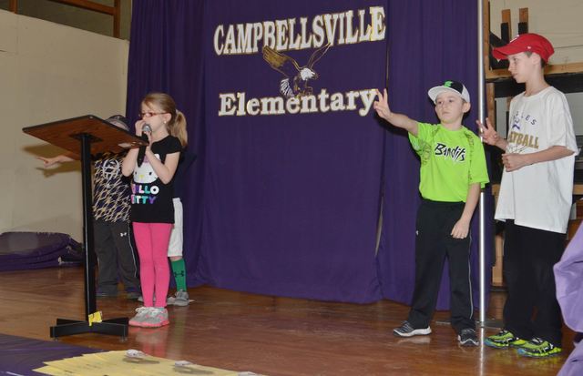 2016-03-16 - Campbellsville Elementary School, 315 Roberts Road (campus), Campbellsville, KY - Photo by Calen McKinney, Public Information Officer, CIS. CES Lighthouse Team members lead the school in reciting the Seven Habits of Highly Effective People. From left are second-graders Cayton Lawhorn and Gracie Pendleton, first-grader Lanigan Price and third-grader Rowan Petett. Students at CES used their stage for the last time on Friday, March 11, 2016. The stage will be removed as part of the school’s renovation project, and turned into a classroom. CES had used the stage each Friday morning for its weekly assembly. Calen McKinney