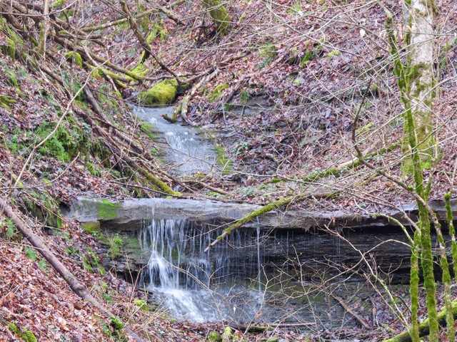 2016-03-14 - Melson Ridge Road, Magisterial District 3, Columbia, KY - Photo by Linda Waggener, CM. It's seasonal, only during and following heavier rains, such as the ones on Sunday, March 13, 2016, but this charming waterfall was just one of the lovely sites along Melson Ridge Road, KY 3265, between Inroad and Cundiff. Yesterday volunteer daffodils were in full boom along the way. Forsythia was beginning to show. Plum thickets were more in evidence. and I'm happy to say, I saw the first noticeable redbud making a show. The little falls is approximately one mile away from a year round falls, on Machine Branch, on land owned by Billy Bloyd. (Machine Branch Falls in winter by Bob Burt). - EW