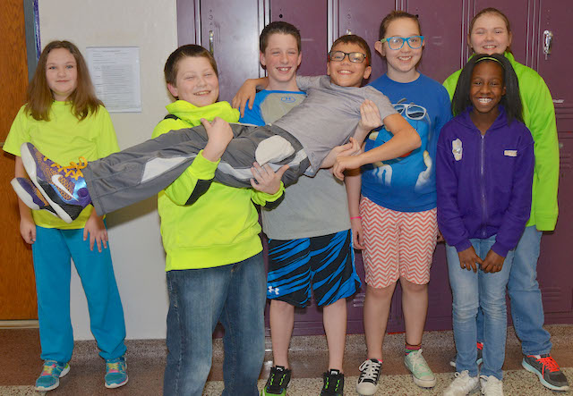 During the Dr. Seuss reading celebration, CMS sixth-graders dressed for Wacky Wednesday. Having fun with photo time are from left: Savannah Gumm, Bailey Stearman and Seth Hash holding Logan Phillips, Kaylie Crick, Myricle Gholston and Isabella Vannice.