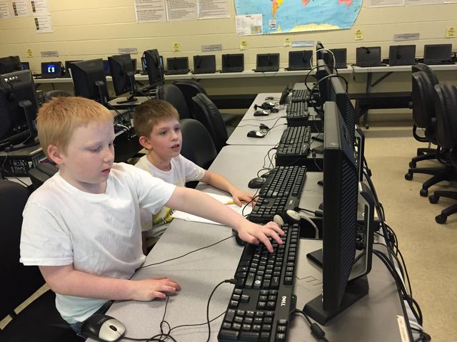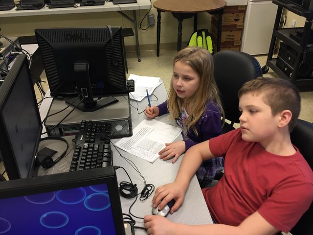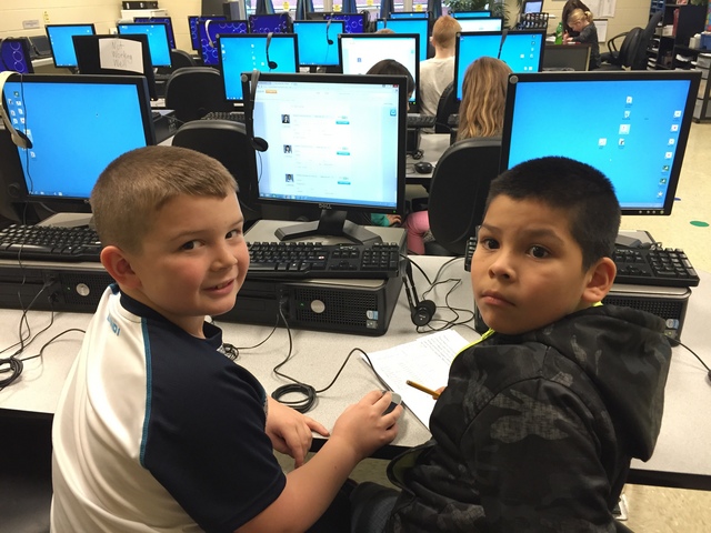Bryce Russell and Fernando Garcia check their class roster with photos taken for the S.T.L.P. yearbook at Adair County Primary Center. - Laura Marcum