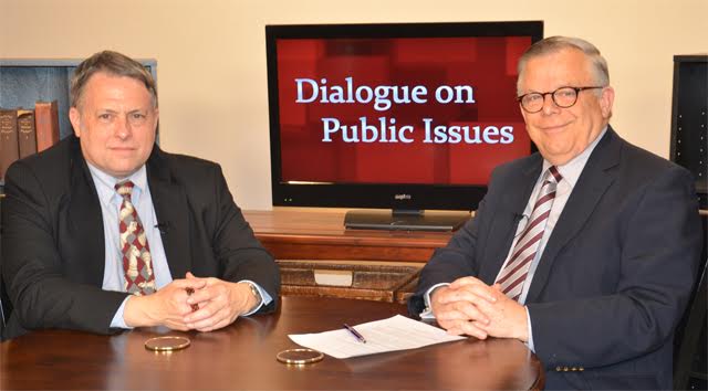 2016-03-10 - WLCU Broadcast Studios, 203 West Broadway, Campbellsville, KY - Photo by Jordan Antle. Dr. John Chowning, executive assistant to the president of Campbellsville University for government, community and constituent relations, right, interviews Dr. Doug Bandow, a senior fellow at the Cato Institute who specializes in foreign policy and civil liberties, for his "Dialogue on Public Issues" show. The show will air the following times: on WLCU-TV, Campbellsville University's cable channel 10 and digital channel 23, Sunday, March 13 at 8amET; Monday, March 14 at 1:30pmET; Tuesday, March 15 at 7:30pmET; Wednesday, March 16 at 1:30pmET; and Thursday, March 17 and Friday, March 18 at 8pmET; and on 88.7 The Tiger radio at 8amET Sunday, March 13, 2016. - Jordan Antle