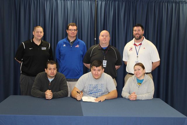 Leo Medina signed with Lindsey Wilson Football on Tuesday, March 8. Pictured with Leo are his parents. Front row, Jose Medina, Leo Medina, and Veronica Medina; Back row, LWC Head Coach Chris Oliver, Assistant ACHS Coach Jared Radford, Assistant ACHS Coach Wes Stephens, and Adair County Head Coach Travis Gay.