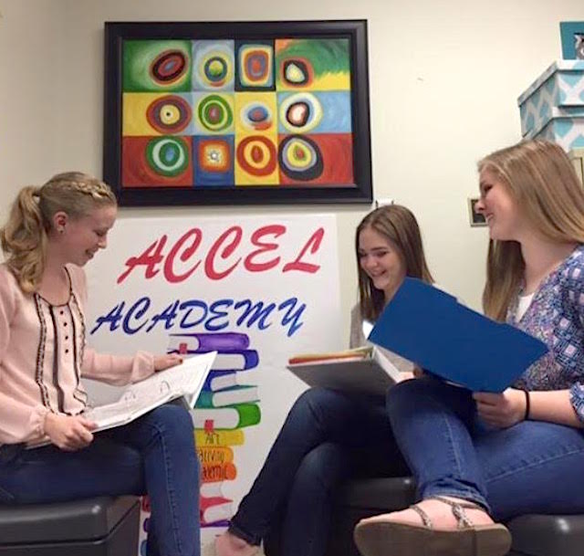 2016-03-07 - ACHS 526 Indian Drive, Columbia, KY - Photo by Candice Flatt. ACCEL Academy President, Lauren McQuaide discusses plans with Vice President, Alayna Willis and Secretary, Sydney Waggener, about plans for using the gifted and talented "Magic School Bus" to do science based lessons with ACPC students under Mrs. Flatt's guidance during the month of April. - From Adair County Gifted & Talent's ACCEL Academy