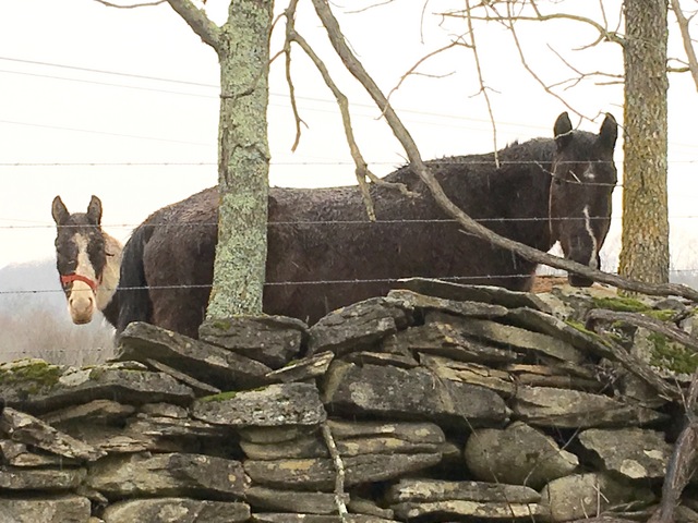 Looking out over the historic rock fence from their grazing spot, these two bid us good Saturday morning. Rain was ruffling their coats but they were dealing with it. -- LW