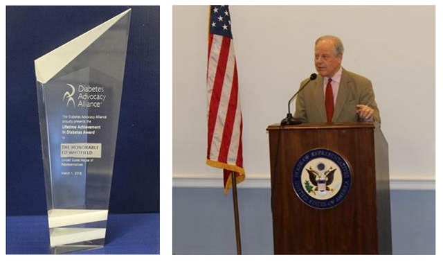 2016-03-05 - Washington, DC - Photo from the office of Rep. Ed Whitfield. U.S. Rep. Ed Whitfield (KY-01) received a Lifetime Achievement Award from the Diabetes Advocacy Alliance during a reception held this week in Washington, DC. Whitfield served as Co-Chair of the Congressional Diabetes Caucus for the past five years before stepping down ahead of his retirement this fall. The Congressional Diabetes Caucus was founded in 1996 and is among the largest caucuses in Congress. "It is an honor to receive this award, just as it has been to be a part of the Congressional Diabetes Caucus," Whitfield said. "Though I do not have diabetes, I have seen first-hand from my constituents the challenges this disease poses for Americans of all ages. Our efforts these past few years through the Congressional Diabetes Caucus have helped combat this disease and hopefully will one day play a part in ending diabetes once and for all."