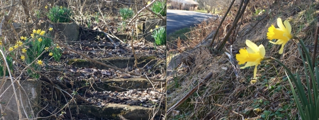 2016-03-05 - Roley, KY - Photo By Linda Waggener. We were drawn to take pictures of these beautiful roadside Daffodils, and then took a moment to listen to the old Chelf voices across the road from the Roley Cemetery, and from The overgrown steps in the photo at left went up to an old Chelf home once located there and the foundation still waits for someone to build again. The closeup at right looks south toward the crossroads at Knifley, where imaginings of some old Chelf home being tugged from this family epicenter to Knifley, as the Old Coyles did in "Shipping News," is evoked, but that almost certainly never happened. - Ed & Linda.