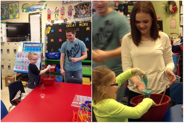 At left Jaiden Taylor enjoys Cade Wall's reaction to touching the Oobleck they created in Rocket Science. At right Sydney Waggener and Miley Stotts check the consistency of the Oobleck.