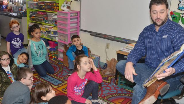 Mat Hopper reads to Campbellsville Elementary School kindergarteners. - Calen McKinney