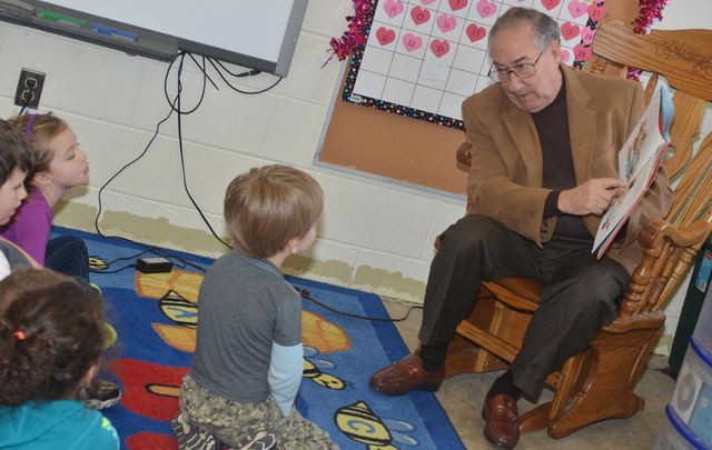 2016-02-29 - Campbellsville Elementary School, 315 Roberts Road (campus), Campbellsville, KY - Photo by Calen McKinney, Campbellsville Independent Schools photo. Al Hardy reads to Campbellsville Elementary preschool students. - Calen McKinney