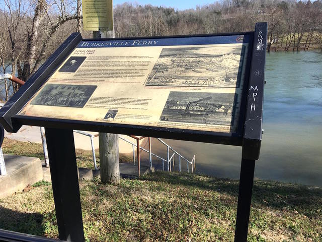 The Cumberland River was at a high stage on Saturday, February 27, 2016, as seen from the Roadside Marker commemorating the Burkesville Ferry and the unwelcome social call by a rascal from Trousdale County, TN, CSA General John Hunt Morgan, before be paid further unwelcome calls north into Adair and Taylor Counties. The lowest roadway into the river was underwater, and the Cumberland had swelled beyond the tree lines. Still, safely away from the water, it was, as always, a great place to enjoy one of Pat & Norman Hamilton's BBQ Shoulder Sandwiches. - EW