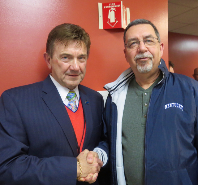 2016-02-21 - Basement, Adair Annex, 424 Public Square, Columbia, KY - Photo by Ed Waggener, CM photo. Adair County Judge Executive Michael Lee Stephens and Dentist-Civic Leader-Great Thinker Dr. Roger Smith, posed for this version of United We Stand at the Wednesday, February 17, 2016 standing room only Town Hall Meeting. Judge Stephens earlier had been effusive in praise of Senator Paul. Dr. Smith, later, was also complimentary of Senator Paul, and thought there ought to be more Town Hall style meetings, like this one, which drew elements from across the political spectrum. - EW