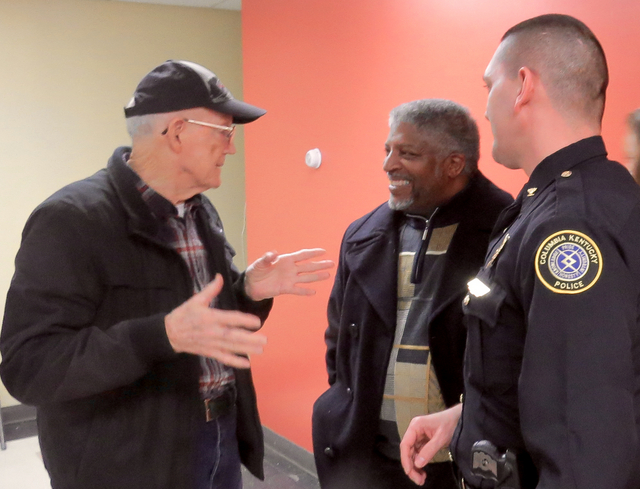 2016-02-21 - Basement, Adair Annex, 424 Public Square, Columbia, KY - Photo by Ed Waggener, CM photo. Adair County Magistrate Greg Caldwell, center, and Columbia Police Chief Jason Cross, listened as Vitus Bailey talked after the Town Hall Forum on Wednesday evening, February 17, 2016.