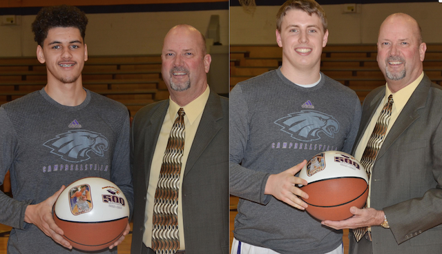 2016-02-21 - Campbellsville High School, 230 W Main (campus), Campbellsville, KY - Photo by Calen McKinney, Public Information Officer, CIS. Campbellsville High School senior basketball players Austin Hash, with 606 career rebounds, right photo with CHS Athletic Director Tim Davis, and A.J. Vaught, 549 rebounds, have joined the school's 500 Rebound Club. Hash and Vaught were honored on Friday, February 19, 2016, before they played in their last regular season game as Eagles.