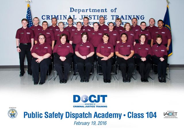 2016-02-20 - Richmond, KY - Photo DOCJT. Class 104 graduates and their agencies are: Samantha M. Adams, Fayette Co. Sheriff's Office, *Adam Bennett, Edmonton/Metcalfe Co. Dispatch; Blake J. Bishop, Cynthiana -Harrison Co. E-911; Ethan D. Blair, Morehead State University P.D.; Brittani Nicole Blankenship, Madisonville P.D.; *Bobbie Rae Brown, Union Co. 911; Megan Coker, Union Co. 911; Misti Drew, Marshall Co. E-911; *Lisa Anne Farias, Pennyrile Emergency 911; Randy K. Gwin, Hazard P.D.; Robin Ann Hamm, Casey Co. 911; Brittany D. Hendricks, Madisonville P.D.; Sarah Lynne Keidel, Breckinridge Co. Sheriff's Office; Lisbeth L. Mares, Madisonville P.D.; J. J. Montgomery, Hazard P.D.; Stevie Newby, Pennyrile Emergency 911; Kenneth B. Pagano, Jefferson Co. Sheriff's Office; *Victoria C. Reams, London/Laurel Co. 911; Lillian G. Ruiz-Jimenez, Radcliff P.D.; *Austin Jordan Scherer, Jefferson Co. Sheriff's Office; Chandler Sirls, Marshall Co. E-911; Quinton Smoot, Maysville P.D.; Tabitha L. Tran, Edmonton/Metcalfe Co. Dispatch; and Amanda C. Webster, Carrollton P.D. (*Denotes Trainees of Distinction)