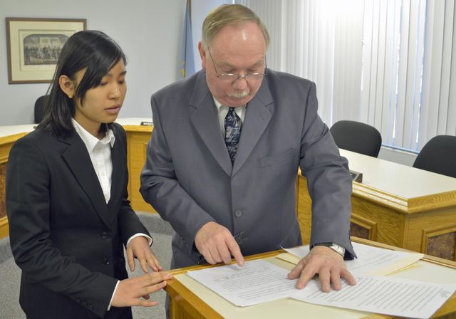 2016-02-19 - City Hall, 116 Campbellsville Street, Columbia, KY - Photo by Duane Bonifer, Lindsey Wilson College. Lindsey Wilson College student Megumi Sasaki of Yamato, Japan, confers with Columbia Mayor Curtis Hardwick before the Coming of Age ceremony. - Duane Bonifer, LWC
